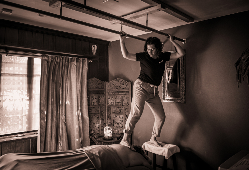 consistent pressure across the body. The therapist uses overhead bars for balance and control, ensuring the pressure is both therapeutic and comfortable.